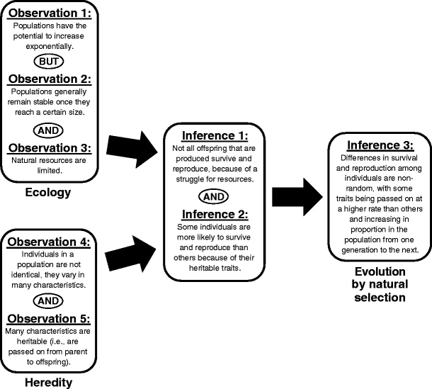 Niet echt een eenvoudige zin. Zie het schema hier onder voor de analyse ervan in de reële wereld. De kern van “natuurlijke selectie” van Darwin bevat vijf feiten (directe observaties) en drie aannames die uit die feiten kunnen afgeleid worden.